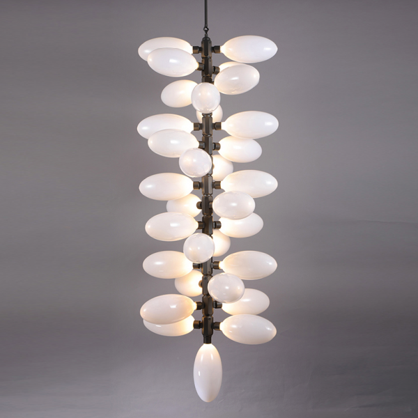 Каждая люстра состоит из большого количества плафонов нанизанных на алюминиевые подвижные позвонки. Что дает возможность видоизменять люстру, давать ей естественное ниспадание. Каждый плафон выдувается вручную - что дает особенное, в полном смысле этого слова, неповторимое, изящество.